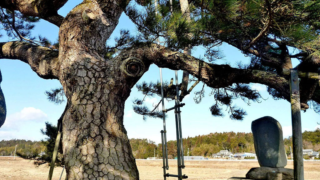 ひとつの枝に一葉と二葉の葉が混ざるということで一葉マツと呼ばれています。県の天然記念物に指定されています。震災後も生き延びました。